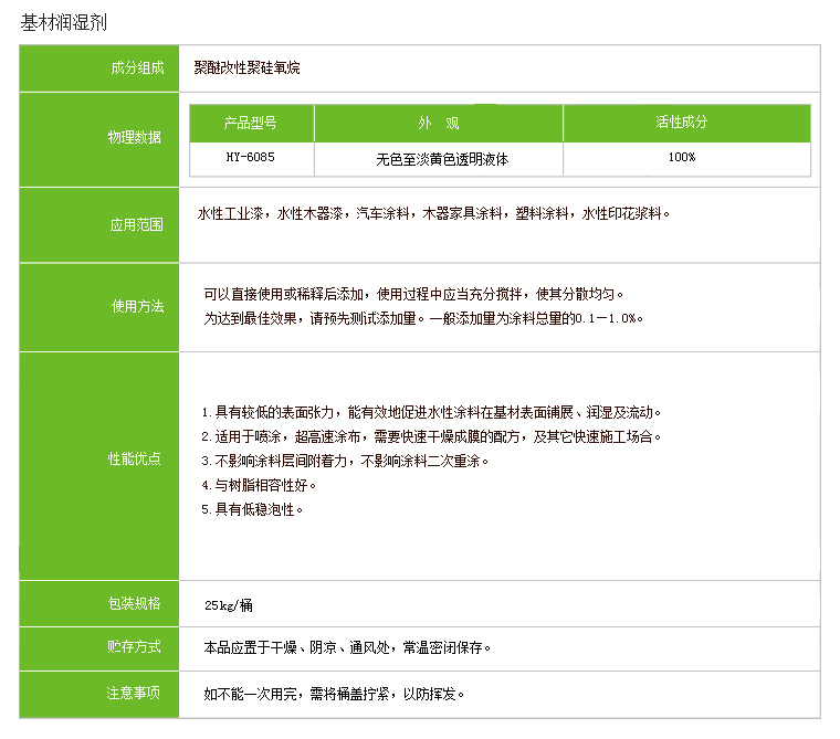 HY-6085基材润湿剂具有优异的基材润湿性和渗透性,能提高涂料对基材的附着力,有效防止缩孔,且与树脂具有很好的相容性,不影响涂料性能,不增进滑爽、不影响层间附着牢度和重涂性。