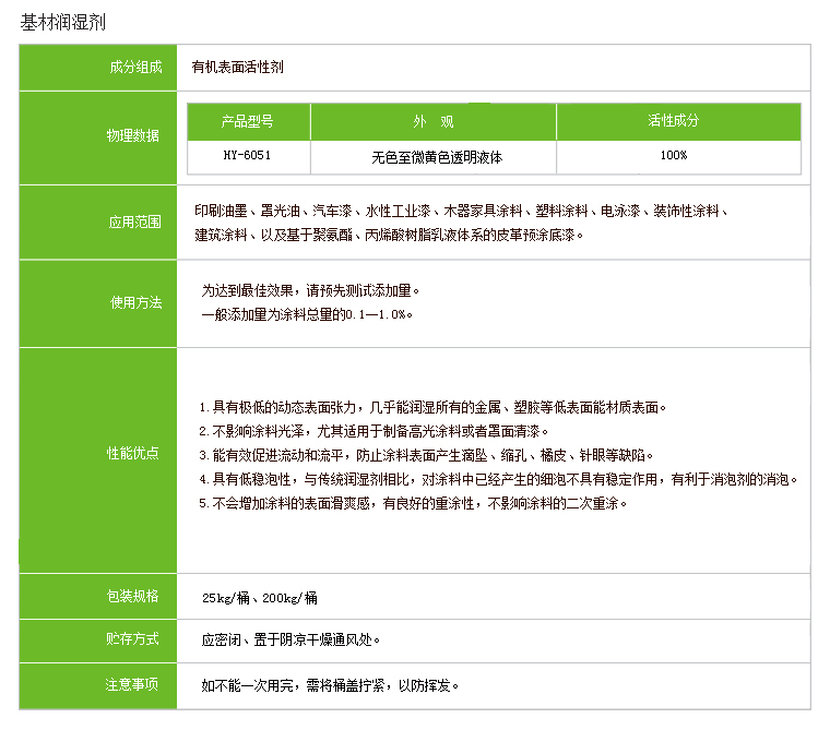 HY-6051基材润湿剂不含有机硅,是一种性能极佳的表面张力改性剂,可以有效降低涂料的表面张力,使涂料对基材的润湿性提高。且具有低起泡性。同时,可以明显改善涂料流平性能、光泽度。