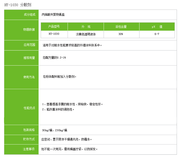 HY-1030分散剂能显著的提高漆膜的耐水性、降粘快,稳定性好。能很好的改善涂料的调色性。