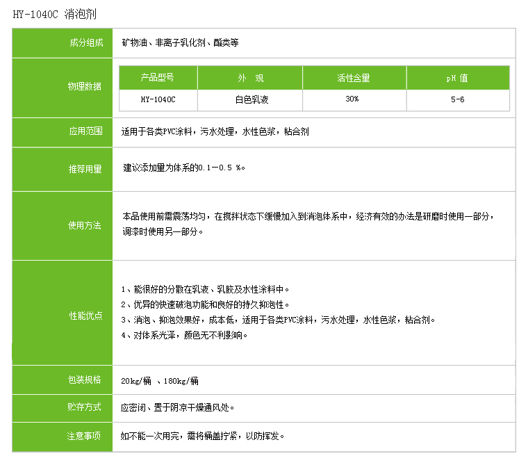 HY-1040C 消泡剂的消泡、抑泡效果好,成本低,适用于各类PVC涂料,污水处理,水性色浆,粘合剂