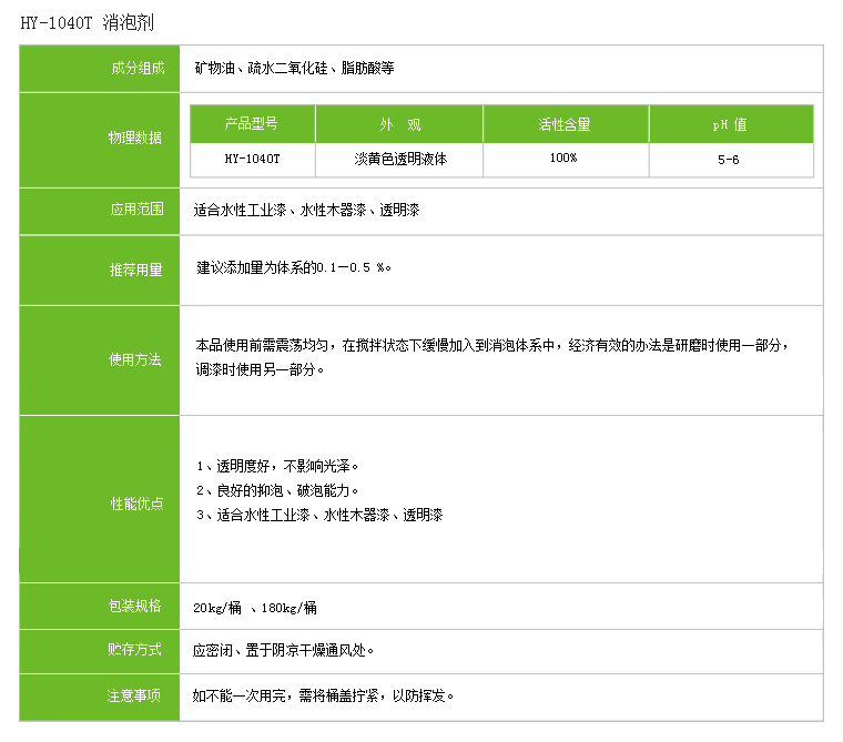 HY-1040T 消泡剂的透明度好,不影响光泽,良好的抑泡、破泡能力,适合水性工业漆、水性木器漆、透明漆