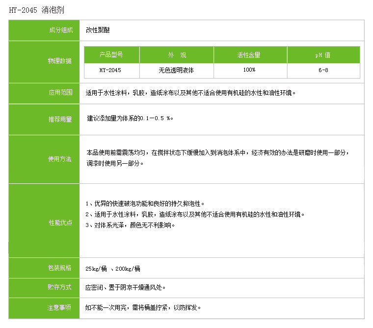 HY-2045消泡剂适用于水性涂料,乳胶,造纸涂布以及其他不适合使用有机硅的水性和油性环境.