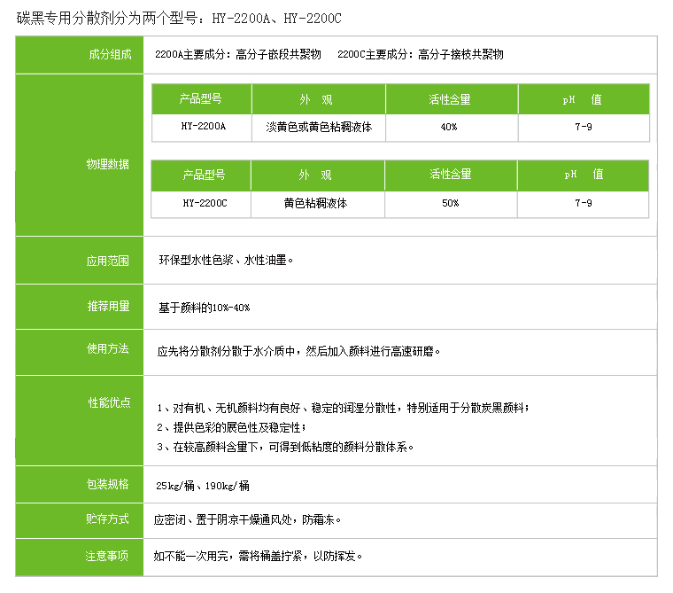 HY-2200 分散剂 对有机、无机颜料均有良好、稳定的润湿分散性,特别适用于分散炭黑颜料,酞青蓝颜,能提高色彩的展色性及稳定性