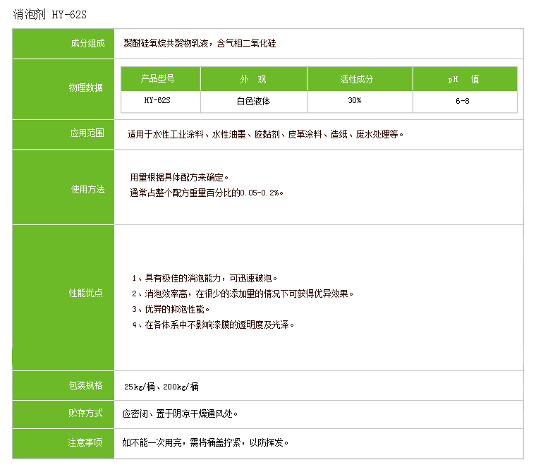 HY-62S是一种有机硅消泡剂,强消泡性,具有极强的破泡与抑泡能力,对消除微泡效果极佳,特别适合各种高粘度体系的消泡