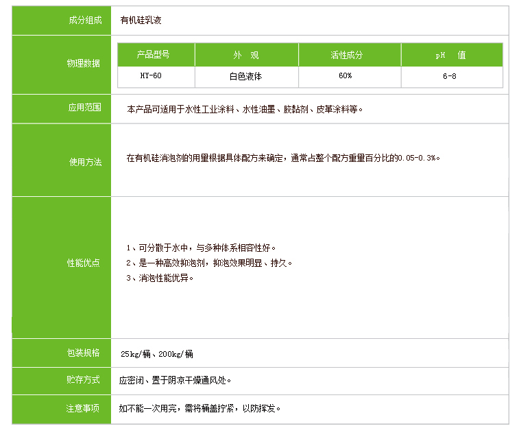 水性工业漆消泡剂HY-60是一种高固含、高效水性消泡剂,对多种水性体系具有突出的快速消泡性、强抑泡性、通用性广等;适用于消泡效果要求较高、长效、相容性较好的体系